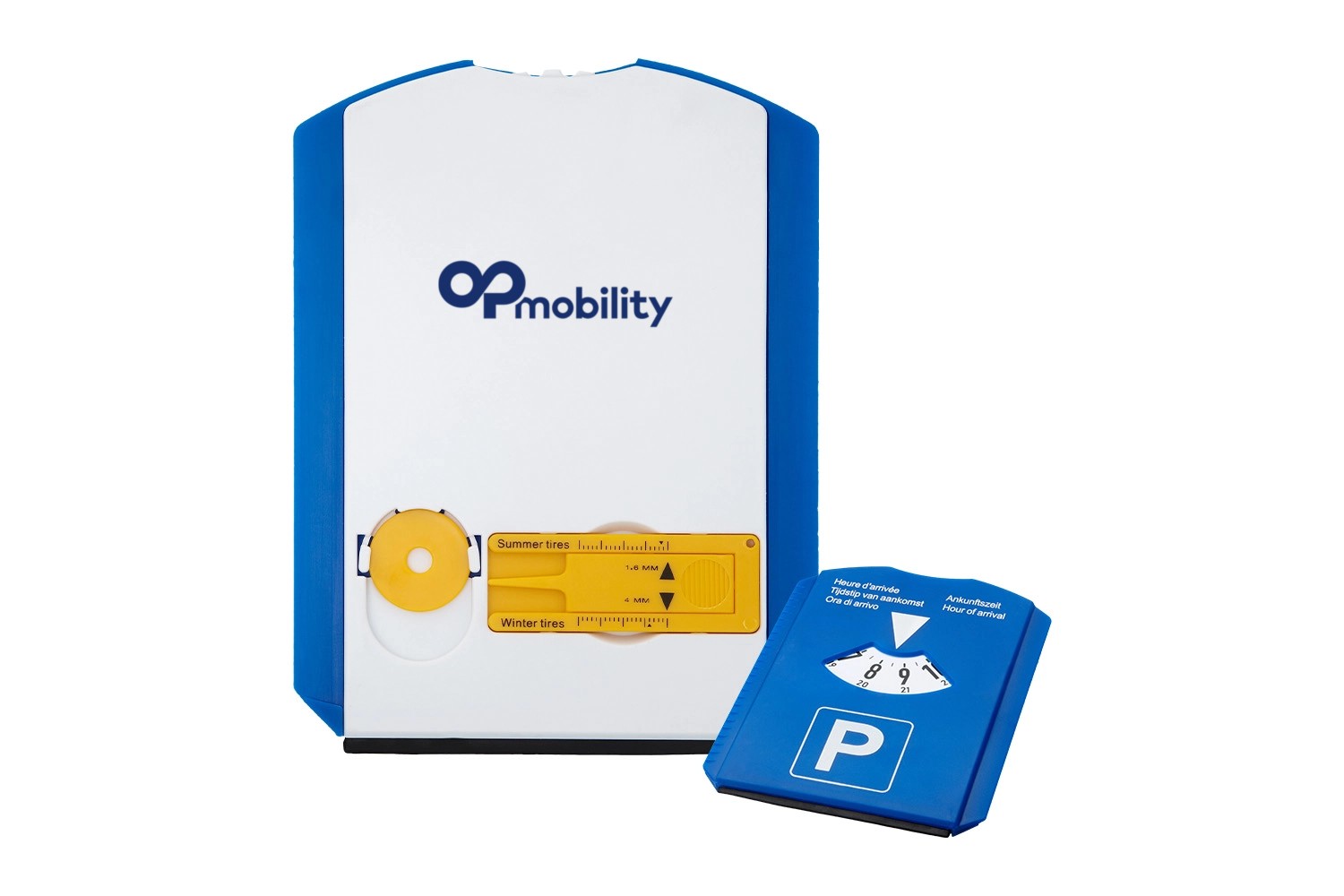 5-in-1 Parkscheibe mit Eiskratzer, Gummiwischer, Einkaufswagen Chip und Reifenprofilmesser. Großer weißer Logobereich auf der Rückseite. „Ankunftszeit“ auf der Vorderseite in den Sprachen Niederländisch, Englisch, Französisch, Deutsch und Italienisch. Vorschriften können sich je nach Ort unterscheiden.